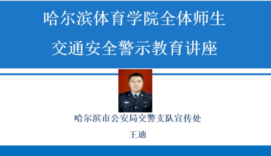为宣传交通安全知识、强化我校师生道路交通安全意识,有效预防道路交通事故发生,结合“122全国交通安全日”提升我校师生交通安全避险能力,保卫处特别邀请哈尔滨市交警支队宣讲员王迪于12月29日14点为我校师生进行交通安全警示教育讲座。