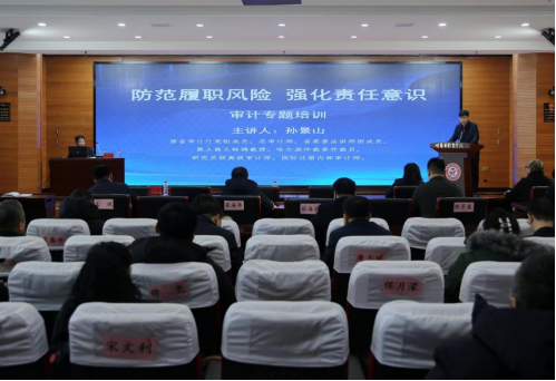 为落实全面从严治党的总体要求,助力学校治理能力和治理体系现代化建设,加强学校党风廉政建设,进一步提升学校干部履职尽责能力,防范履职风险,强化责任担当意识,提升审计服务质量,1月4日上午,学校组织召开“防范履职风险 强化责任意识”审计专题培训。原省审计厅党组成员、总审计师、省委普法讲师团成员孙景山应邀授课,学校处级干部及审计处、财务处全体成员参加讲座。学校党委委员、副校长王广贵主持会议。