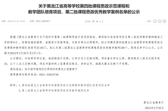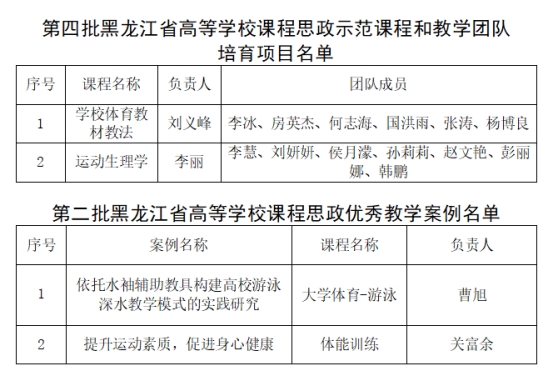 近日,黑龙江省教育厅公布《关于黑龙江省高等学校第四批课程思政示范课程和教学团队培育项目、第二批课程思政优秀教学案例名单的公示》,共遴选出课程思政示范课程和教学团队培育项目105项,第二批课程思政优秀教学案例108项。我校推荐的《学校体育教材教法》《运动生理学》2门本科课程获批省级课程思政示范培育项目,推荐的《大学体育——游泳》《体能训练》获批省级课程思政优秀教学案例。截至目前,我校共获批省级课程思政示范项目7项,省级课程思政优秀教学案例3个。