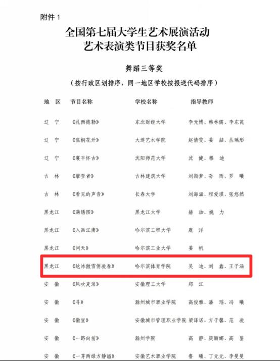 近日,教育部公示了2024年全国第七届大学生艺术展演活动获奖名单。本届全国“大艺展”以“厚植家国情怀,涵养进取品格”为主题,我校报送的原创舞蹈作品《屹冰傲雪俏凌春》荣获艺术表演类舞蹈组三等奖的佳绩。