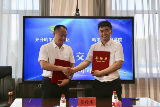 建华区委常委、组织部部长姜雅秋与哈尔滨体育学院副校长王广贵签订《共建人才工作站协议》。