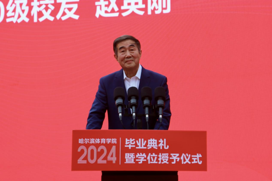 80级校友赵英刚发言,他向顺利完成学业的毕业生们表示祝贺,对母校和恩师的培养表示感谢。他以自己多年的冰雪管理工作经历勉励学弟学妹们要保持积极向上的心态。无论在未来的学习和生活中遇到多少困难和挑战,都要勇敢地面对,积极地解决,勇往直前;要坚持不懈地追求自己的梦想。不断地追求和努力,让我们的梦想成真。愿同学们未来可以站在哈体的臂膀上为祖国的体育事业涂上更多绚丽的色彩!