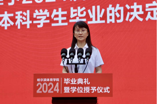 党委委员、副校长齐景嘉宣读《哈尔滨体育学院关于准予2024届王东明等1213名本科学生毕结业的决定》《哈尔滨体育学院关于授予2024届王东明等1200名本科学生学位的决定》