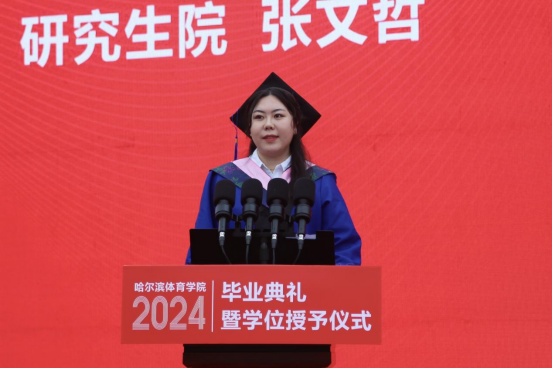 三名毕业生代表分别回顾了难以忘怀的大学旅程,深情地感谢了母校和老师们的辛勤培育和谆谆教诲,表达了对家人、老师、同窗的感激不舍和对母校的美好祝愿。他们号召即将奔赴各行各业的年轻学子们要志存高远,胸怀天下,踏着前辈奋斗的足迹,在干事创业的青春赛道上奋力奔跑,努力跑出属于我们的加速度和最好成绩,不断书写为中国式现代化挺膺担当的哈体院青春篇章。