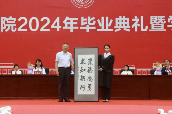 校党委副书记、校长陈德明代表学校接受毕业生敬献的带有哈体院校训的书法作品