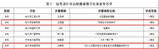 近日,第十一届黑龙江省高校微课教学比赛和高校青年教师多媒体课件制作比赛圆满落幕。我校荣获一等奖两项、二等奖三项及优秀组织奖共六项。其中,体育教育训练学院教师王砚镭、马克思主义学院教师刘琳琳分别获第十一届黑龙江省高校微课教学比赛一等奖、二等奖;马克思主义学院教师宋磊获第十一届黑龙江省高校青年教师多媒体课件制作大赛一等奖,体育教育训练学院教师高晨辰、体育艺术学院教师卢佳怡获第十一届黑龙江省高校青年教师多媒体课件制作大赛二等奖,同时学校获得了第十一届黑龙江省高校青年教师多媒体课件制作比赛优秀组织奖。