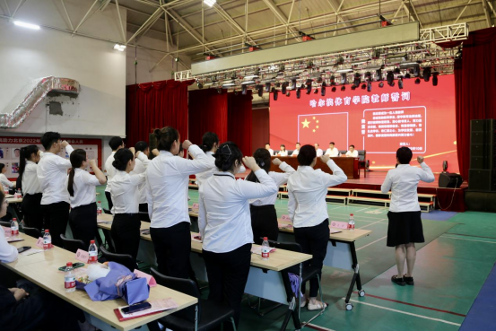 “我志愿成为一名人民教师,忠诚党的教育事业,遵守教育法律法规,履行教书育人职责,引领学生健康成长,做到有理想信念、有道德情操、有扎实学识、有仁爱之心,为教育发展、国家繁荣和民族振兴努力奋斗!”体育教育学院李雪艳教授带领新入职教师代表庄严宣誓,誓言声响彻全场。