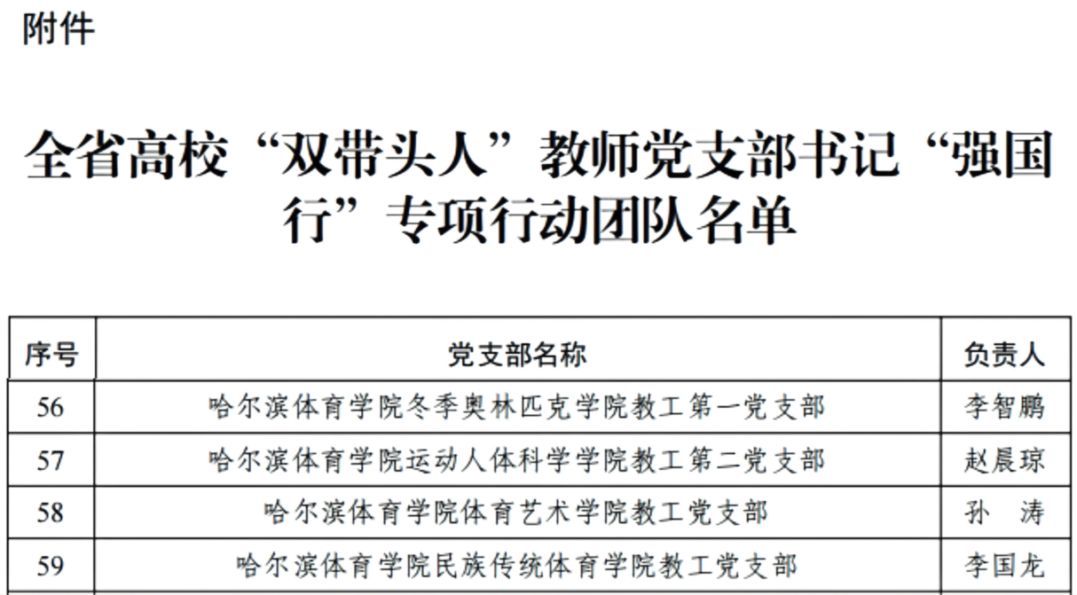 近日,省委教育工委公布了全省高校“双带头人”教师党支部书记“强国行”专项行动团队名单,我校推荐申报的冬季奥林匹克学院教工第一党支部、运动科学与健康学院教工第二党支部(原运动人体科学学院教工第二党支部)、体育艺术学院教工党支部、民族传统体育学院教工党支部,4个教师党支部全部入选。这是我校基层党组织建设的一次新突破,也是学校以高质量党建保障高质量发展的重要体现。
