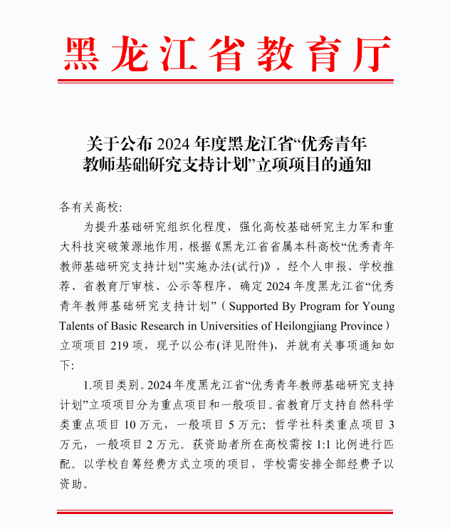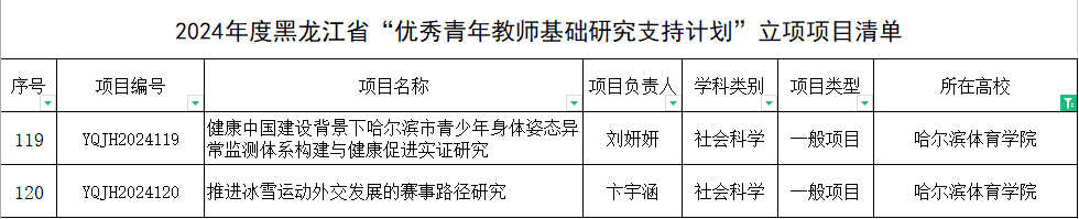 近日,黑龙江省教育厅发布了《关于公布2024年度黑龙江省“优秀青年教师基础研究支持计划”立项项目的通知》,我校刘妍妍负责的《健康中国建设背景下哈尔滨市青少年身体姿态异常监测体系构建与健康促进实证研究》、卞宇涵负责的《推进冰雪运动外交发展的赛事路径研究》2个项目入选。