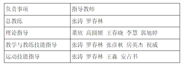 在学校领导、教务处、运动科学与健康学院的大力支持下,体育教育学院细致研判竞赛规则,经专项教师推荐、教练组研判,从专项能力突出的优秀学生中快速组建集训团队,制定为期6周的训练计划。我校12位教师参与到集训队的理论、教学技能、教练技能、运动技能四个项目的指导工作,具体名单如下: