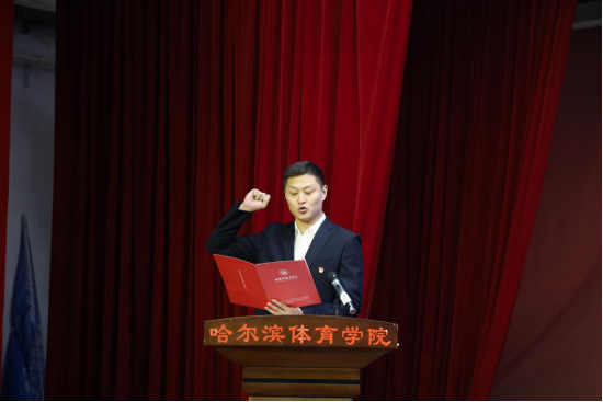 冬奥学院党总支副书记张大德带领全院服务亚冬会师生庄严宣誓,誓言秉承“奉献、友爱、互助、进步”的志愿者服务精神,立志以实际行动服务亚冬、贡献“哈体”力量。