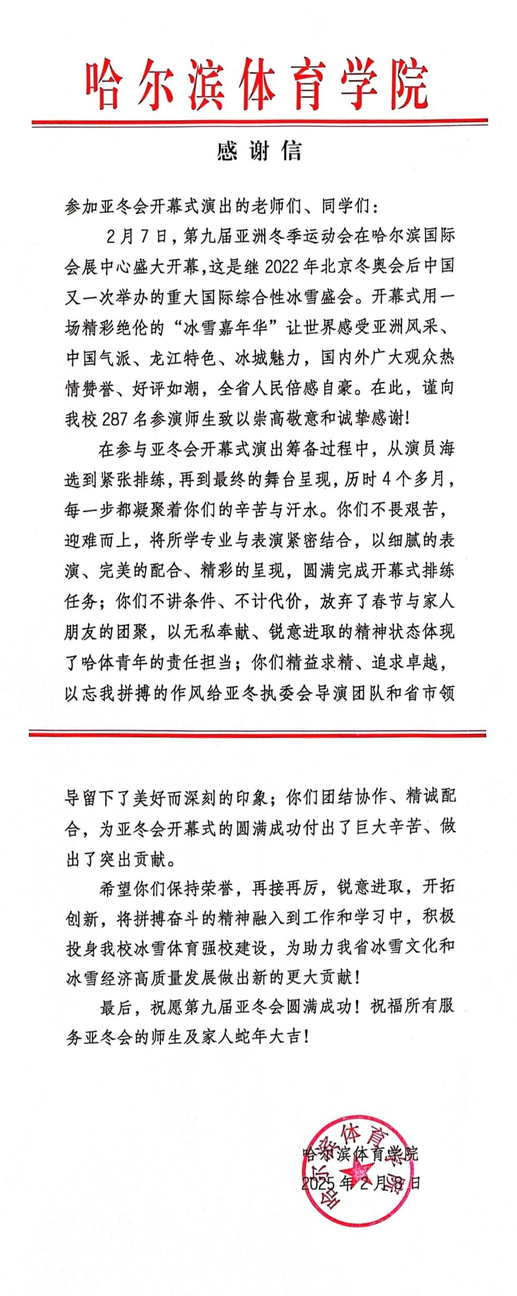 致参加亚冬会开幕式演出的老师们、同学们的感谢信