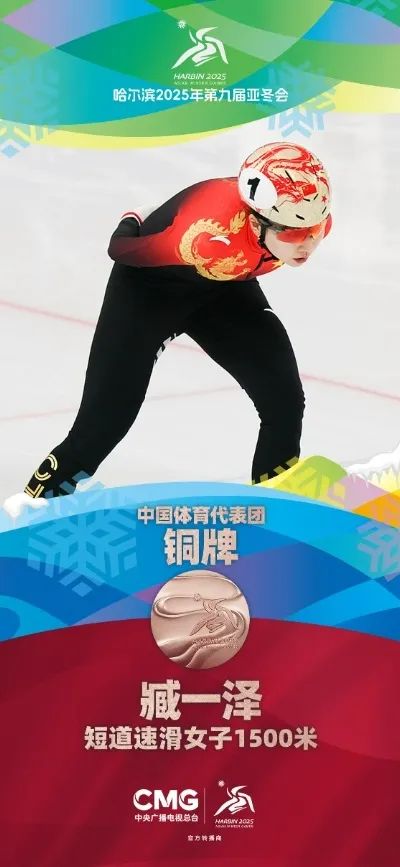 2月8日,哈尔滨亚冬会短道速滑女子1500米决赛,我校教师臧一泽以2:23.965的成绩获得铜牌。