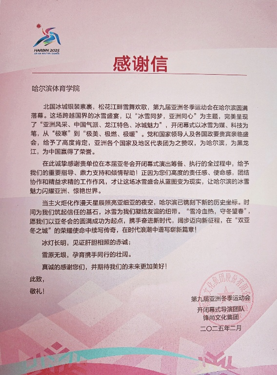 第九届亚冬会开闭幕式导演团队向我校致感谢信