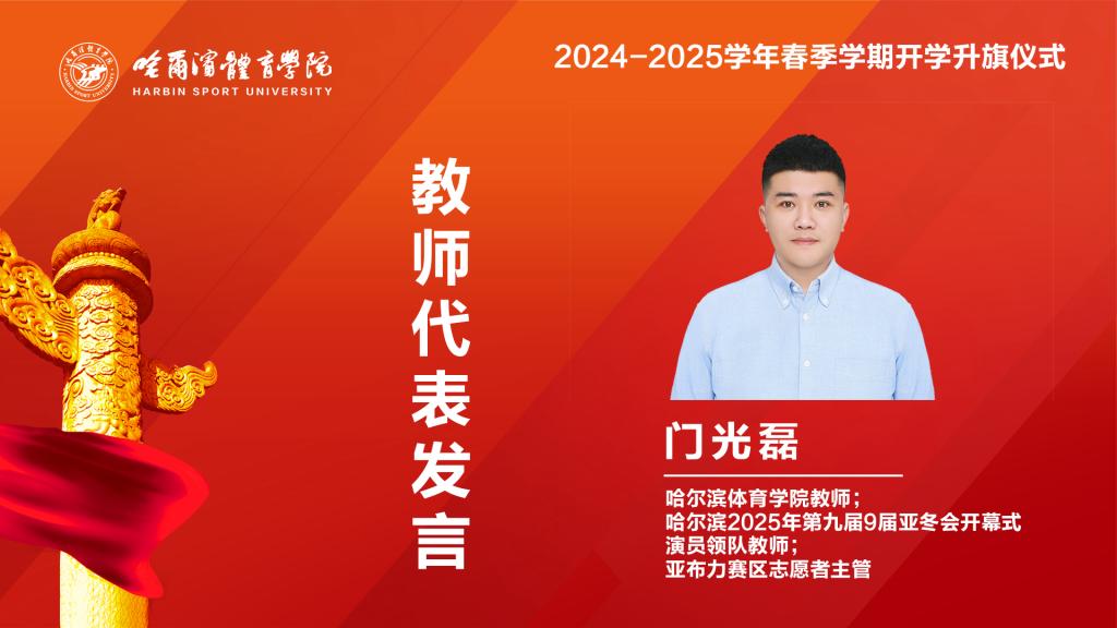 冬季奥林匹克学院辅导员、哈尔滨2025年第9届亚冬会开闭幕式演出演员领队、志愿者骨干教师门光磊作为教师代表发言,他讲述了自己在亚冬会中与学生们的点滴故事,号召同学们要积极参与社会实践和志愿服务,用实际行动诠释新时代青年的责任与担当。