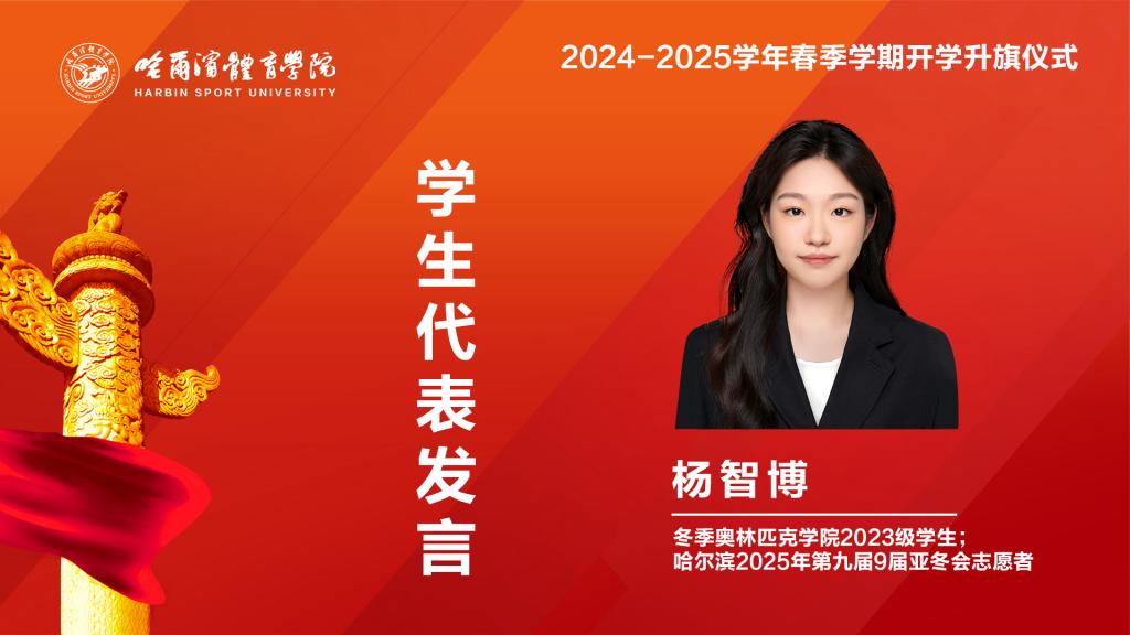 随后,冬季奥林匹克学院2023级学生、国家一级冰壶运动员,2024年国家奖学金获得者杨智博作为学生代表进行发言,她分享了自己在学习和训练中的心得体会,鼓励同学们要珍惜时光,努力学习文化与专业知识,刻苦锤炼体育技能,为实现个人价值和体育强国梦想而不懈奋斗。