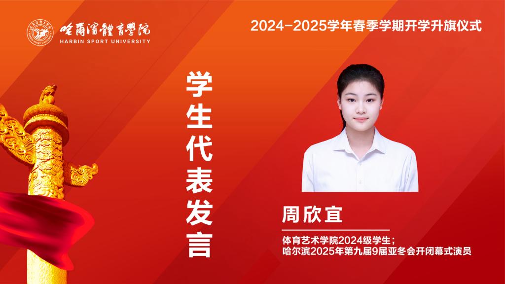 最后,体育艺术学院2024级学生、哈尔滨2025年第9届亚冬会开闭幕式演员周欣宜作为学生代表发言,她回顾了自己在亚冬会开幕式上的精彩表现,感谢学校和老师的悉心栽培,并表示将继续努力,为学校的荣誉和体育事业的发展贡献自己的力量。