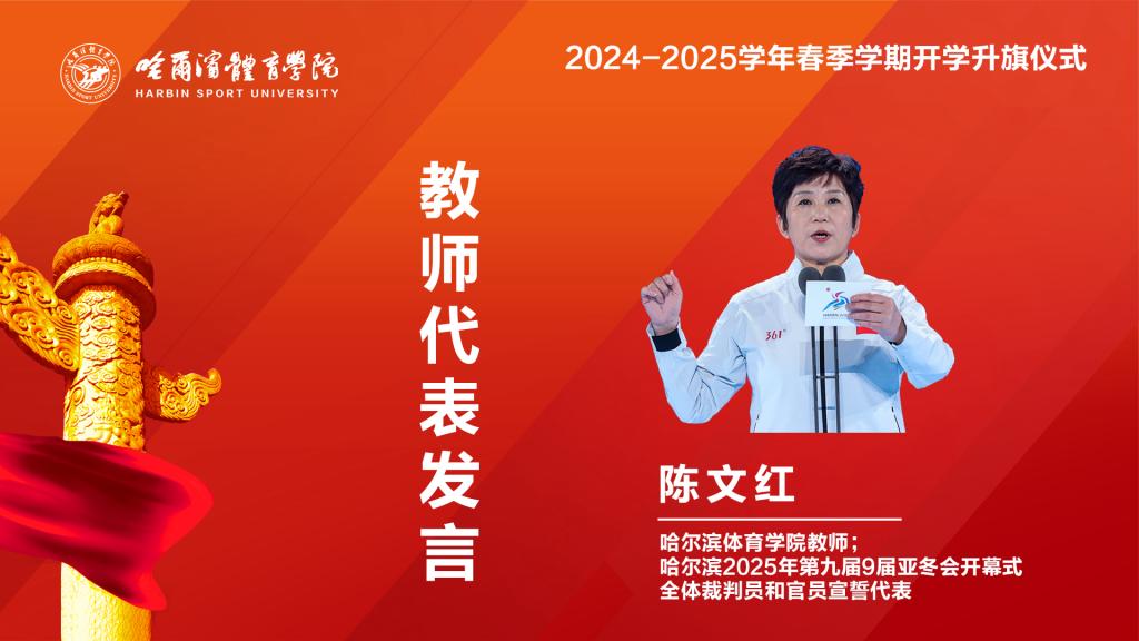 升旗仪式后,冬季奥林匹克学院教授、短道速滑国际级裁判员、哈尔滨2025年第9届亚冬会开幕式全体裁判员和官员宣誓代表陈文红,作为教师代表进行国旗下发言,她分享了自己作为裁判员在亚冬会上的所见所闻,鼓励同学们要勇于追求梦想,不怕困难,不断超越自我,为国家和学校争光。