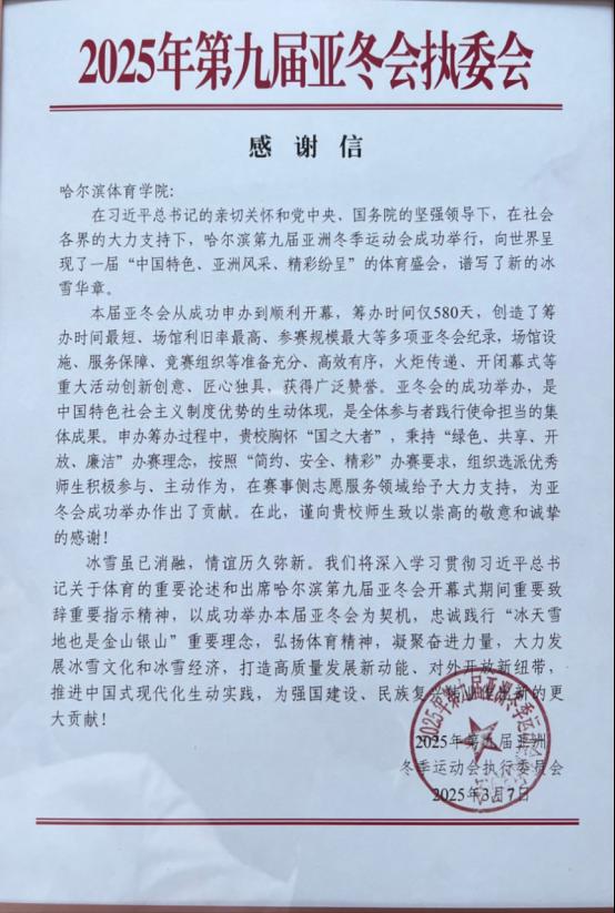 本届亚冬会,我校深度参与各项筹办工作,700余名志愿者师生以饱满的热情、专业的技能、严实的作风圆满完成了志愿服务工作。接下来,学校将持续做好亚冬盛会“后半篇文章”,将志愿者鲜活生动的亚冬故事融入学校“大思政”育人体系,将服务赛事成果转化为推动冰雪特色强校建设的强大动力,大力弘扬中华体育精神和冰雪体育文化,传承冬奥精神,讲好哈体故事,在“双亚冬之城”的荣耀使命中续写传奇,在时代浪潮中谱写属于哈体的崭新篇章,为推动中国冰雪体育事业发展贡献哈体力量。