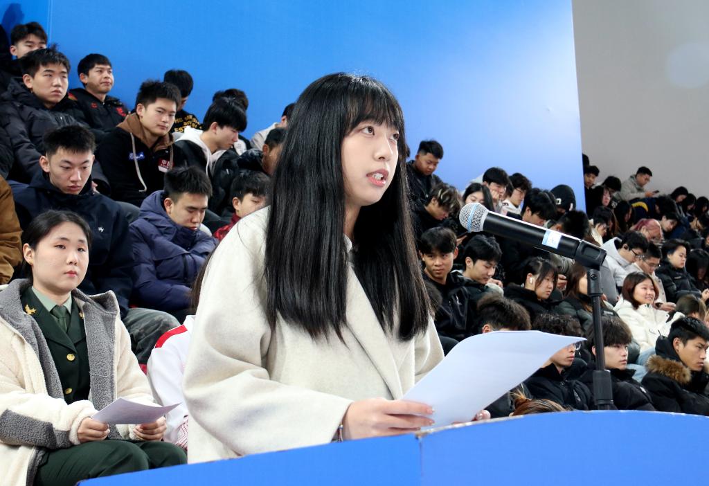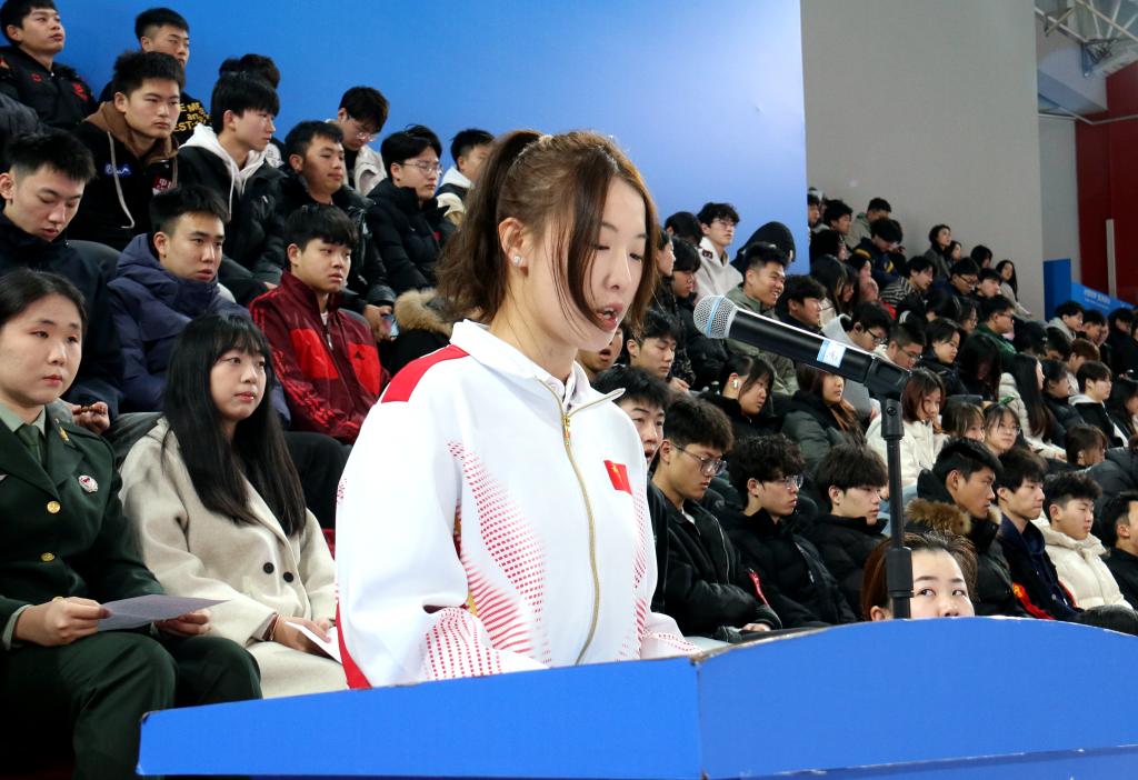 运动科学与健康学院2023级1班李羽彤发言。她曾服役于中国人民解放军陆军,“明者远见于未萌,智者避危于无形。”她呼吁,在全民国家安全教育走深走实十周年的新起点上,让我们坚定不移贯彻落实国家发展安全观,以实际行动为实现中华民族伟大复兴的中国梦筑牢安全屏障。