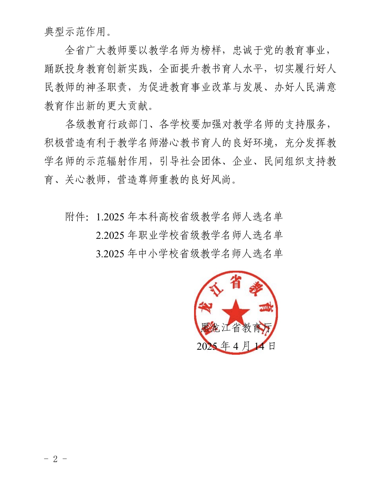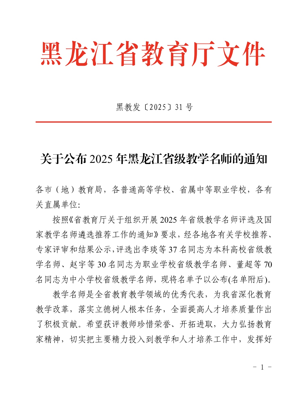 近日,黑龙江省教育厅公布了2025年黑龙江省级教学名师评选结果,我校教师王飞获评2025年本科高校省级教学名师。