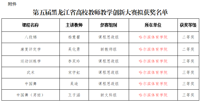 近日,第五届黑龙江省高校教师教学创新大赛圆满落幕。我校教师(团队)凭借扎实的教学功底、创新的教学设计和显著的育人成效,在与全省39所高校559名优秀教师的激烈竞争中表现优异,最终荣获二等奖2项、三等奖4项,获奖总数创我校参赛历史新高,实现省级教师教学竞赛成绩新突破。