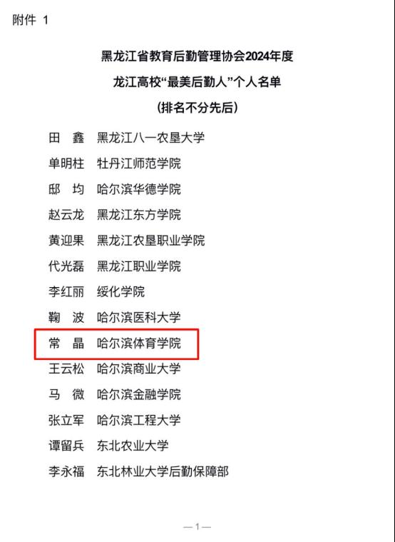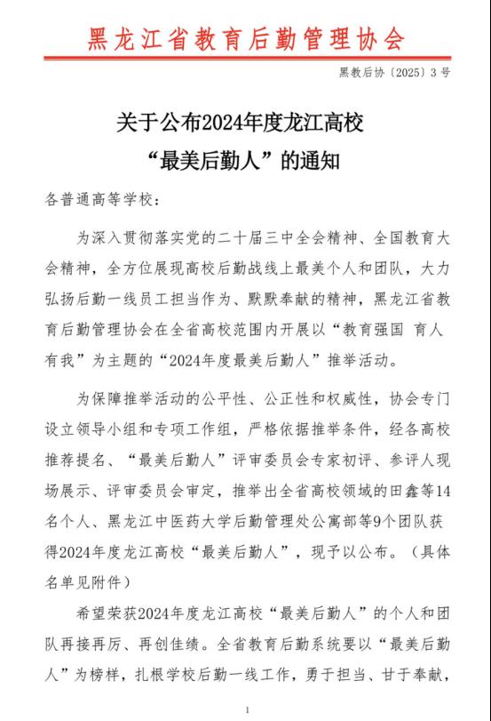 近日,黑龙江省教育后勤管理协会公布了2024年度龙江高校“最美后勤人”评选结果,我校后勤管理处常晶荣获2024年度龙江高校“最美后勤人”称号。