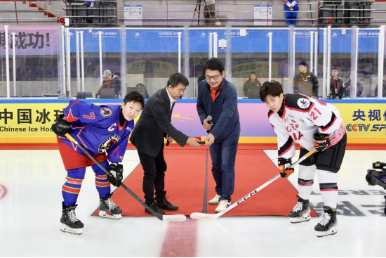 中国冰球协会副主席杨永生和深圳昆仑鸿星冰球俱乐部董事长王行义为比赛开球