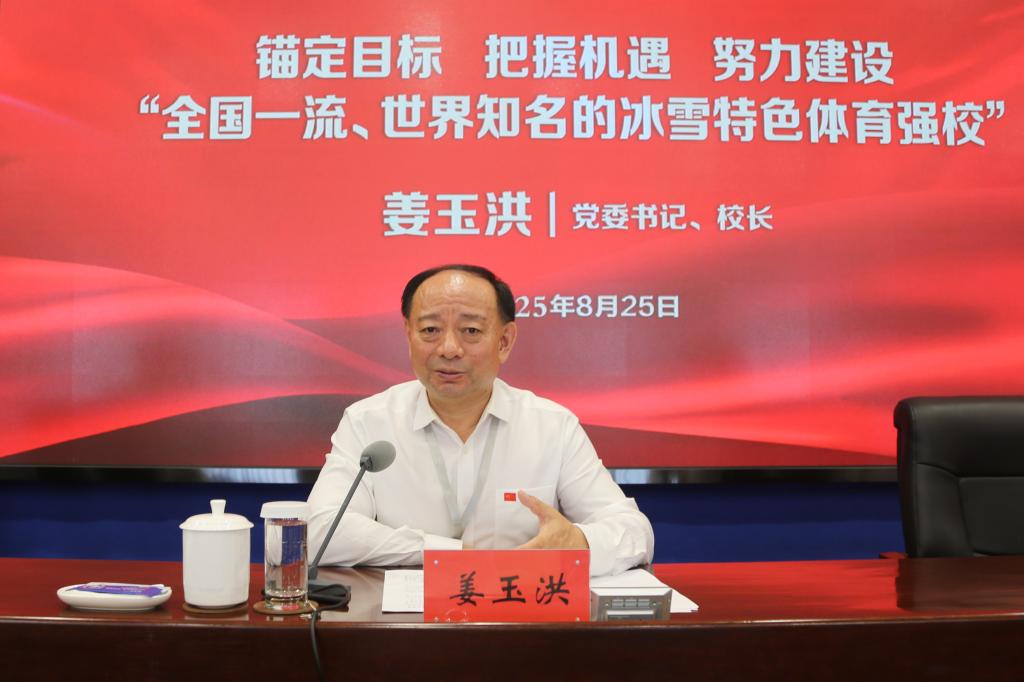 会上,党委书记、校长姜玉洪以《锚定目标 把握机遇 努力建设“全国一流、世界知名的冰雪特色体育强校”》为题,从“学校当前所处的历史方位,学校发展面临的机遇、挑战和未来方向,领导干部如何助推学校内涵式高质量发展”三个方面作了辅导。他全面分析了学校面临的形势,细致梳理了学校“十四五”期间取得的主要成绩,客观指出了作为冰雪特色强校发展存在的一些亟待解决的矛盾和问题。面对国内其他体育院校在冰雪领域的快速布局,哈体院如何依托学科优势和冰雪特色,充分发挥“创新策源地”和“人才蓄水池”作用,助力我省冰雪经济全产业链发展,持续巩固冰雪强省地位,他提出依托哈尔滨体育学院建设的省部共建国家冰雪运动学院,将传统冰雪优势与现代科技深度融合,以“科技赋能冰雪”“跨界融合产业”“开放链接国际”为核心,从单一运动人才培养升级为冰雪产业全链条解决方案提供者,从“单一强项”转向“冰雪生态引领者”的发展思路。为实现“全国一流、世界知名的冰雪特色体育强校”建设目标,他从领导干部角色定位、作风建设、能力提升、履职尽责等方面提出了具体要求。