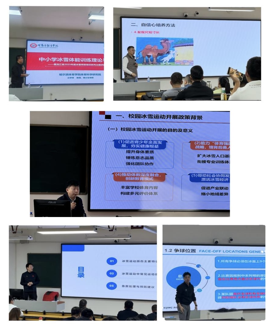 本次培训紧密围绕校园冰雪运动教学实际需求,聚焦冰壶、冰球两大项目,通过“理论+实践”“讲授+研讨”相结合的模式,系统提升参训教师的教学指导能力与专业素养。全部课程由哈尔滨体育学院专业的师资团队承担,其中理论课程主要由教授团队担纲,术科实践方面则派出了拥有冠军经历的团队。培训课程设置方面科学丰富,涵盖我省校园冰雪运动的开展、中小学生冰雪运动心理引导、冰雪教学常见损伤与防治、青少年冰雪体能训练以及项目裁判规则等多个专题。培训期间,学员们还参观了具有深厚底蕴的中国冰雪运动文史馆(哈尔滨体育学院校史馆),并现场观摩了高水平冰壶比赛,实现了理论知识、实践技能与冰雪文化的深度融合。