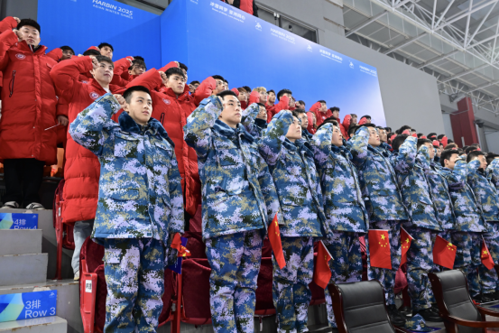 活动在庄严的升国旗仪式中走向高潮,由我校担任过亚冬会旗手的同学组成护旗方队,高擎国旗入场,全场师生肃立,目光追随着缓缓升起的五星红旗,气氛庄重而激昂。随后,国际奥委会委员、冬奥冠军张虹带领全场师生郑重宣誓:“以青春热血筑牢梦想,用实干担当报效祖国”,同学们的铮铮誓言响彻全场。紧接着,千余名师生共同唱响《歌唱祖国》。歌声磅礴而深情,既传递出对祖国的无限热爱,也昭示着新时代龙江青年砥砺前行、续写荣光的坚定决心。至此,这堂沉浸式冰雪思政课在激昂的爱国共鸣中圆满落幕,余韵悠长,振奋人心。