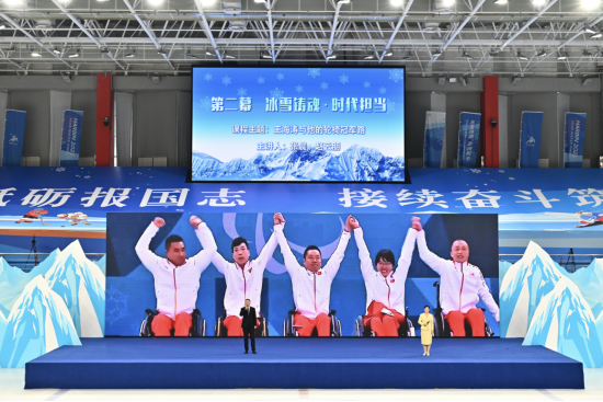 第二幕“冰雪铸魂 时代担当”,由我校教师张晨和赵云朋主讲,以“时代的回答——王海涛篇”为主题,通过真实感人的叙事,生动诠释了轮椅冰壶世界冠军王海涛自强不息、为国争光的奋斗故事,诠释了个人奋斗与国家发展同频共振的时代强音。正在备战米兰冬残奥会的王海涛通过视频发出“将个人梦想融入时代洪流”的号召。我校男子冰球队与平房区青少年冰球队的激烈对抗表演《冰场逐梦》,以竞技之美彰显拼搏精神。