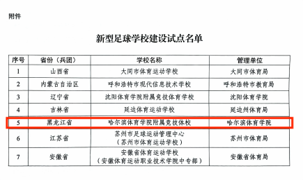 近日,教育部办公厅、国家体育总局办公厅及中国足球协会联合印发《关于开展新型足球学校建设试点工作的通知》,正式公布新型足球学校建设试点名单。哈尔滨体育学院附属竞技体校成功入选,成为黑龙江省唯一获此资格的学校。这是我校继2025年足球运动专业获批并完成首批招生后的又一重大突破,标志着我校在足球人才贯通培养方面迈上新台阶。
