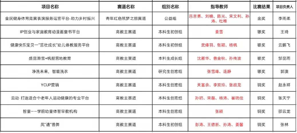 在此次大赛中,《全民健身体育竞赛表演服务运营平台-助力乡村振兴》获金奖、《IP创业与家庭教育动漫画童书平台》、《健康快乐宝贝一“茁壮成长”幼儿体教服务平台》、《盛昆滑雪+帆船营地教育》、《净洗未来,智能洗衣》获银奖、《YCUP营销》、《云动-打造适合中老年人运动健康的专业平台》、《智童——学前幼童体智早教机构》、《凤“遗”兽舞》获铜奖。