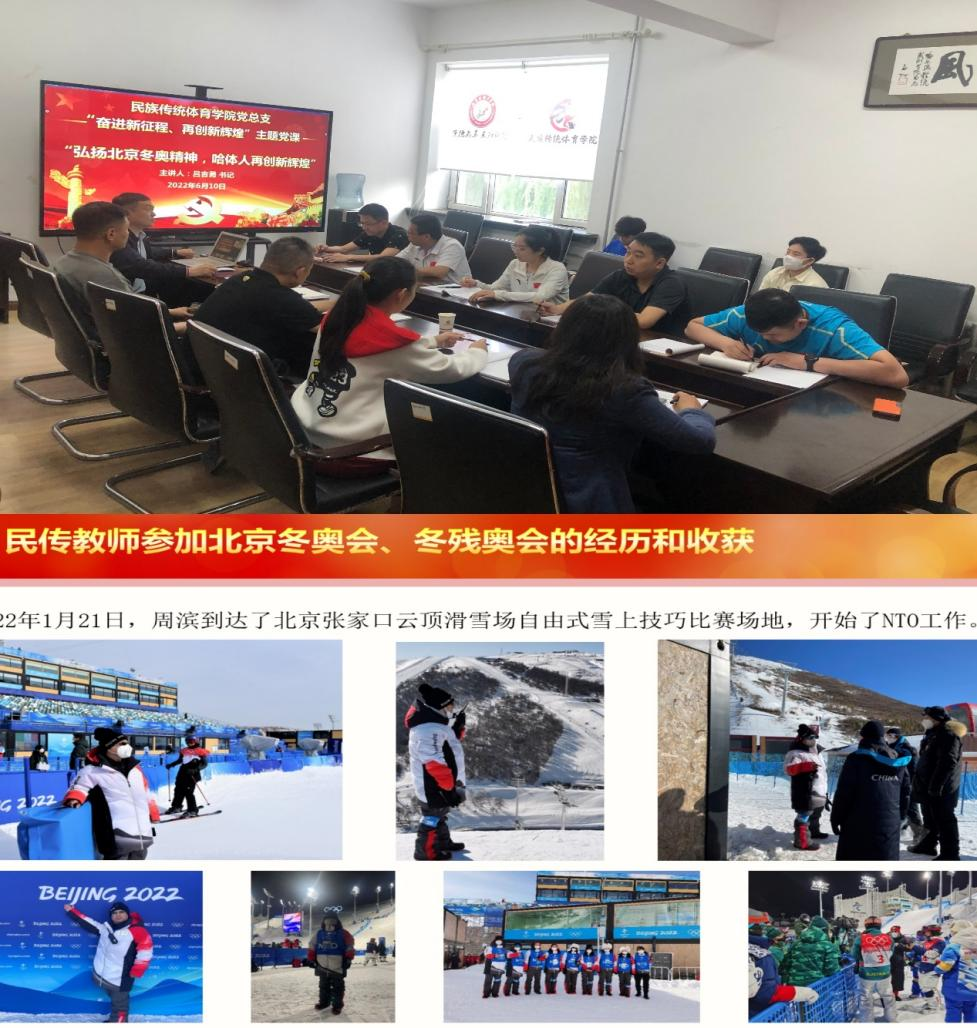 6月10日下午,民族传统体育学院党总支召开了“奋进新征程、再创新辉煌”省第十三次党代会主题党课,题目是“弘扬北京冬奥精神,哈体人再创新辉煌”。本次主题党课主讲人党总支书记吕吉勇将省第十三次党代会精神与北京冬奥精神相结合,与服务助力2022年北京冬奥会、冬残奥会经历相结合,从三个方面进行了讲授:一是民族传统体育学院教师参加北京冬奥会、冬残奥会的经历和收获;二是北京2022冬奥会申办理念和中国冬奥精神;三是弘扬北京冬奥精神,哈体人再创新辉煌。教工党支部书记周滨和学生党支部书记张大德进行了冬奥经历分享。学院全体教师在院会议室现场聆听,全体学生党员线上参会。