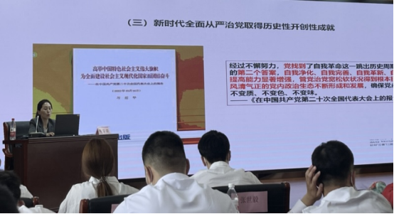 隋芳莉同志以“坚定不移全面从严治党 深入推进新时代党的建设新的伟大工程”为题讲授专题党课。党课围绕党的二十大报告中关于全面从严治党的若干论述,通过从严治党是马克思主义政党的一贯要求、坚定不移全面从严治党是决定中国共产党兴衰成败的关键因素、坚定不移全面从严治党是实现民族复兴的根本保证三个方面阐释了坚定不移全面从严治党的重要意义,解读了全面从严治党推动党的自我革命走向深入所取得的历史性开创性成就等内容。