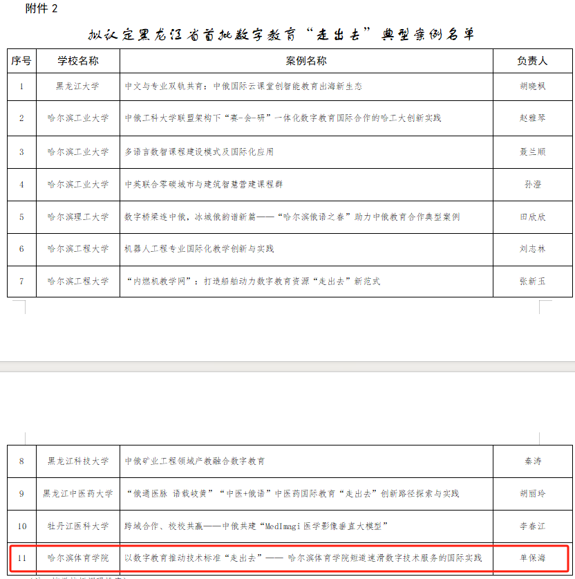近日,黑龙江省教育厅公布首批数字教育“走出去”典型案例名单,我校申报的《以数字教育推动技术标准“走出去”——哈尔滨体育学院短道速滑数字技术服务的国际实践》成功入选,成为我省首批认定的11个数字教育国际化案例之一。同时,我省将3个项目推荐上报至教育部,该项目是其中之一。