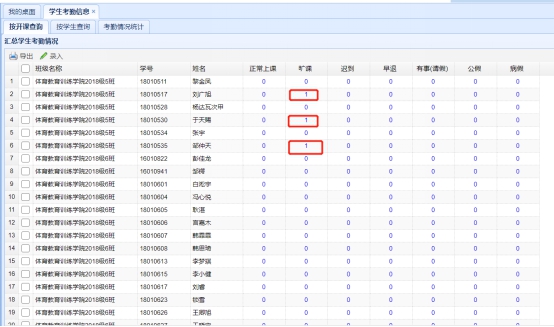 8、关掉图7、图5的界面,返回到图3的界面,系统会对学生考勤情况进行了统计汇总。图下图图8.