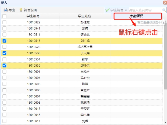 7、在上图图5中,如果哪个或者多个学生旷课,选定这些学生,用鼠标右键点击“考勤标识”