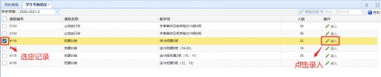 3、选定某一门课程(勾选左边的方框),点击右边的“录入”