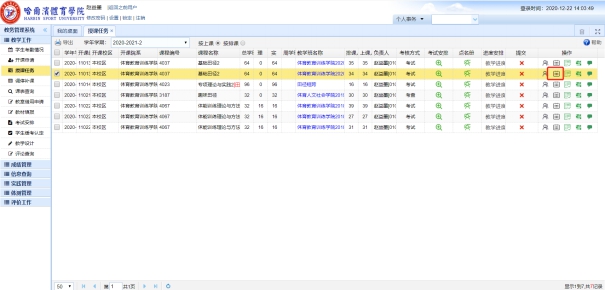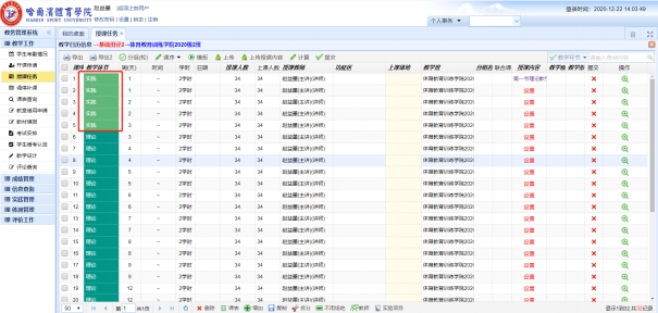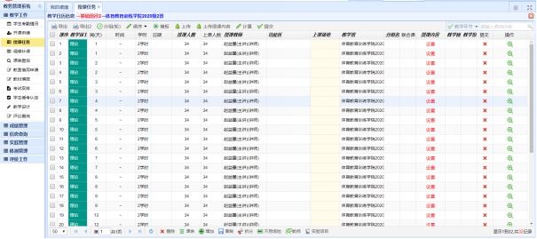 打开浏览器,在地址栏输入http://210.46.216.43/,账号为教师工号,初始密码为hty工号#。之后,首先点击左边菜单栏中中的“授课任务”,在 授课任务 界面 选择相应的学年学期等查询条件,系统列出授课任务,如下图所示。