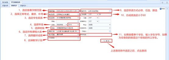 注意:在第6个课程大类中,系统默认没有“术科”,需要选定“术科”,第8个计划类型中,默认是“教学计划”,将“教学计划”前面的√去掉,计划类型是空。
