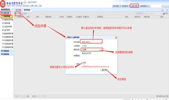1.学生登录系统,点击业务办理——缓考申请,点击申请,学年学期默认是当前学年学期,不要选别的学年学期,别的学期不可以申请的。选择这个学期要缓考的课程,填写申请原因,点击选择上传申请缓考的材料图片(比如生病受伤的医院诊断),然后点击增加。