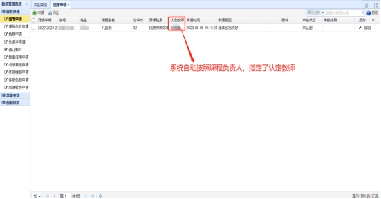 2.申请之后,结果如下图,并且系统自动指定了课程负责人进行缓考认定。
