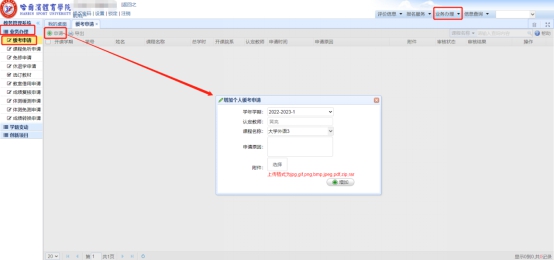 学生登录系统,点击业务办理—缓考申请,点击申请,学年学期是默认当前学年学期,别的学期不可以申请。选择这个学期要缓考的课程,填写申请原因,点击选择上传申请缓考的材料图片(比如生病受伤的医院诊断),然后点击增加。如下图: