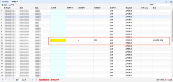 当学生缓考申请审核通过之后,学生成绩标志自动变为“缓考”,示例如下: