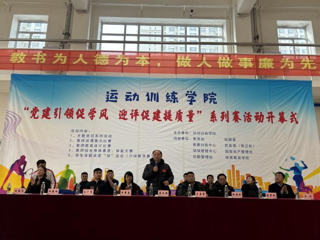 2024年11月27日,运动训练学院举行了“党建引领促学风,迎评促建提质量”系列活动赛开幕式。校长姜玉洪、副书记王春雷、副校长齐景嘉、副校长王广贵、工会主席赵俊岭、各职能部门相关领导及运动训练学院全体教师和参赛学生等出席开幕式。运动训练学院副院长马怡冰主持开幕式。院长吕吉勇在开幕式上致辞。